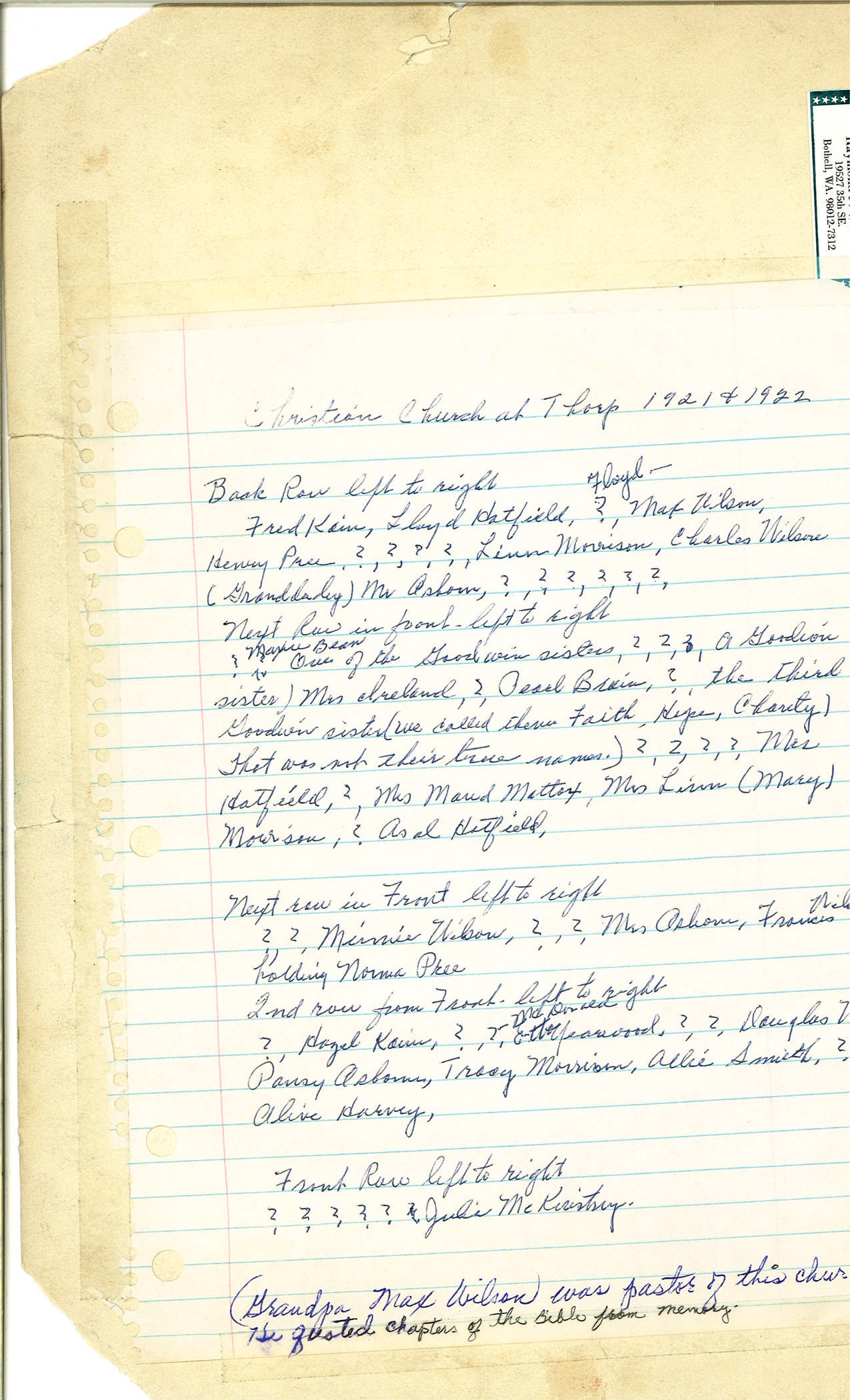 P275 194849Thorp Christian Church R1left Virginia Lee Wilson R34thfromleft Ailene Wilson King Reginald Douglas Nellie Roan Wilson